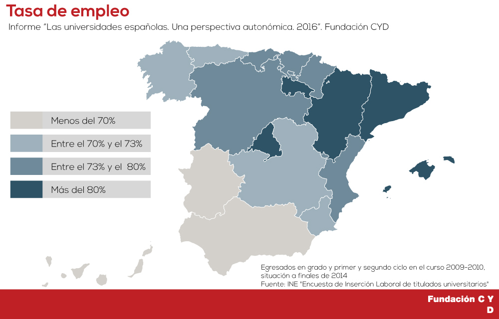 Además, respecto a informes de años anteriores, se incorpora como novedad una serie de indicadores regionales de inserción laboral, a partir de sendos trabajos recientes del Ministerio de Educación, Cultura y Deporte, utilizando la vida laboral de la Seguridad Social, y del INE, a través de una encuesta, y que, en ambos casos, se basa en los egresados del curso 2009-2010 y su situación en el mercado de trabajo en 2014.